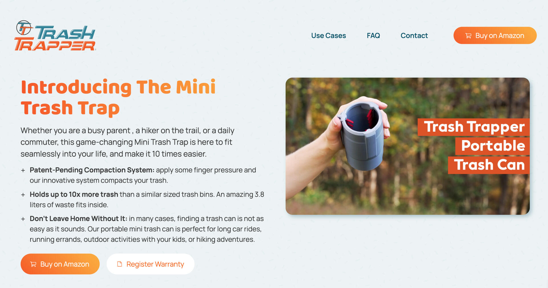 Landing page to promote an innovative portable personal trash compactor invention (patent pending).